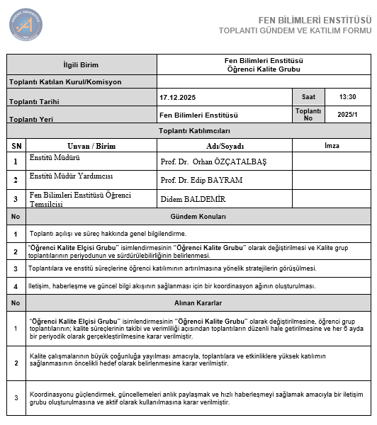 FEN BİLİMLERİ ENSTİTÜSÜ ÖĞRENCİ KALİTE GRUBU